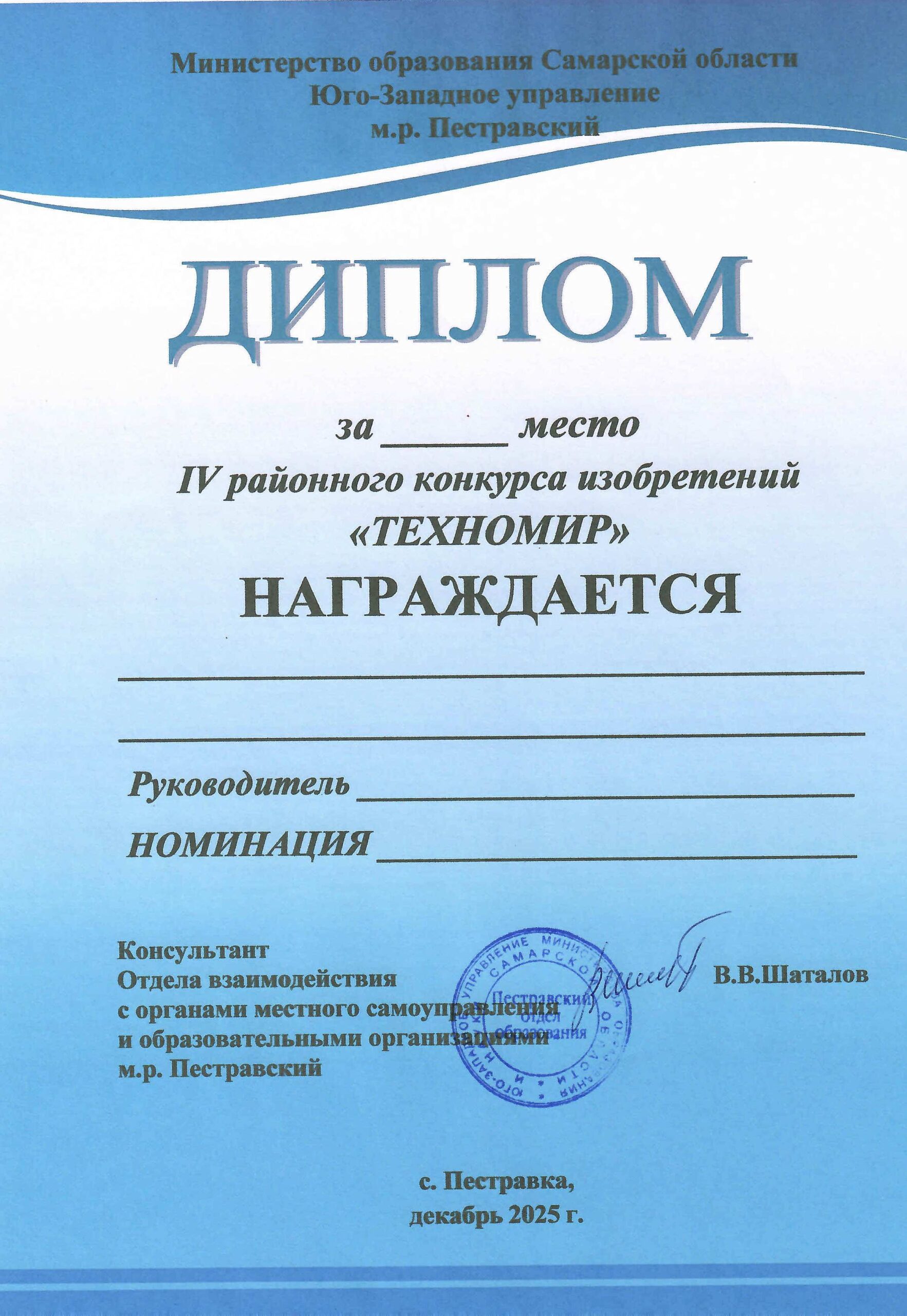 Диплом Победителя (Призёра) районного конкурса «ТехноМир»